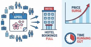4月は「桜のシーズン」とも重なり、観光客によるホテルの奪い合いが1年で最も激化する時期です。🌸